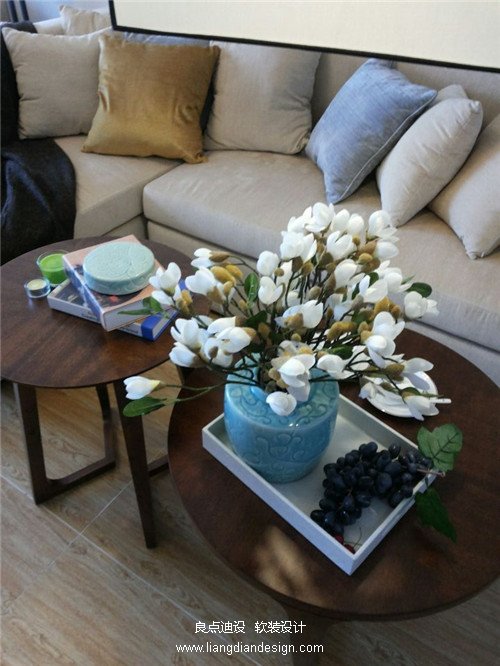 空間軟裝色彩:柚木色 象牙色、灰藍(lán)色