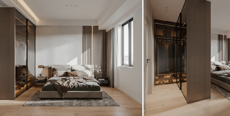 在房頂凹槽處做燈帶設(shè)計(jì)代替原有的主燈,實(shí)現(xiàn)極簡(jiǎn)大方的燈具設(shè)計(jì),讓整個(gè)房間簡(jiǎn)潔明亮,視覺上房間更加寬敞,L型透明衣柜,在臥室中形成了小型衣帽間,同時(shí)能作為隔斷,分隔洗浴區(qū)和睡眠區(qū),茶色的透明玻璃柜門提升空間的通透感,實(shí)用又高級(jí),拿取衣服更加方便,更有一種精致的高級(jí)感,讓衣柜中的衣服成為一種展示品,美觀與實(shí)用兼具。