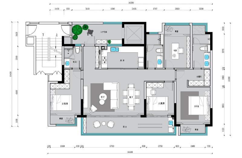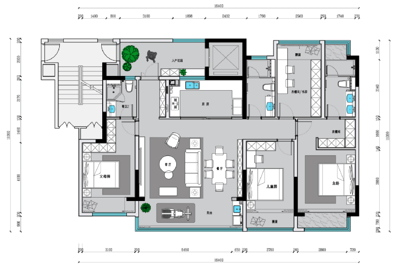 四間臥室,三間朝南,采光充足,父母房中帶有獨(dú)立衛(wèi)浴,方便老人起夜,衛(wèi)生間更是要做適老化設(shè)計(jì),方便老人居住和使用,沿墻面定制的L型收納柜,***利用拐角空間,收納功能強(qiáng)大。兒童房帶有飄窗,視覺效果寬敞,改良采光,讓房間更加明亮,稍微裝飾下,鋪幾個(gè)蒲團(tuán),坐在午后的陽(yáng)光里,看書喝茶擼貓。主臥中L型衣柜設(shè)計(jì),形成獨(dú)立的小型衣帽間,浴室中兩個(gè)盥洗盆設(shè)計(jì),方便男女主人早上上班時(shí),不會(huì)出現(xiàn)匆忙爭(zhēng)搶的現(xiàn)象。朝北臥室設(shè)計(jì)成衣帽間和書房,解決家中收納問題,同時(shí)也提供了獨(dú)立安靜的學(xué)習(xí)工作空間。