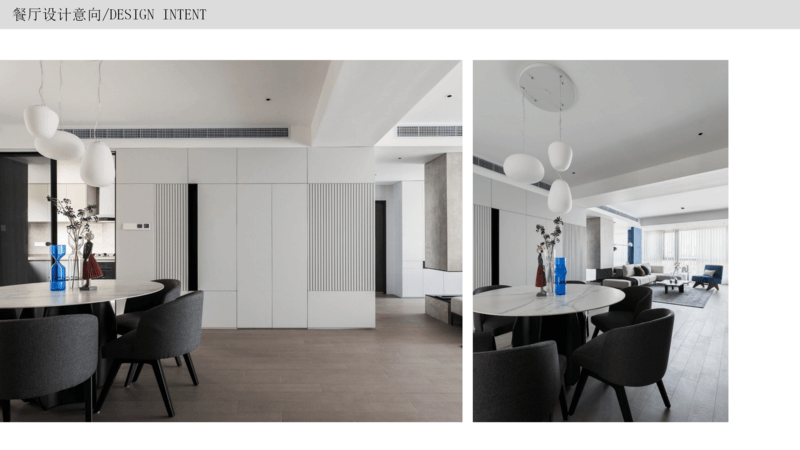 餐廳借助門(mén)廳長(zhǎng)走廊,放置六人位的圓桌,原始布局餐廳位置稍小,所以沒(méi)有收納的區(qū)域,利用西墻增加收納設(shè)置餐邊柜,作為廚房區(qū)域收納的補(bǔ)充或者當(dāng)做酒柜也是極好的。