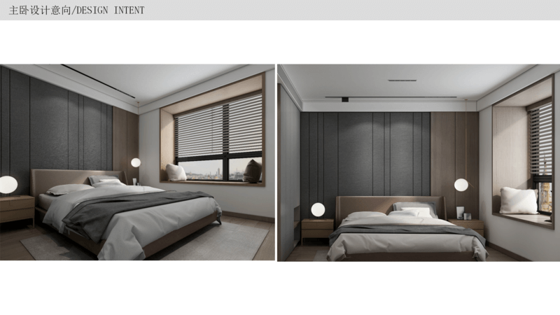 主臥 交付時(shí)帶有飄窗,可以將飄窗位置利用起來(lái),改造成一個(gè)mini的學(xué)習(xí)區(qū),背景墻按照風(fēng)格和喜好做硬包,在床尾設(shè)立斗柜和化妝臺(tái),滿(mǎn)足女主人的日常需求,因?yàn)橹髋P帶衣帽間,所以收納已經(jīng)足夠了,主要以裝飾和體驗(yàn)感為主。
