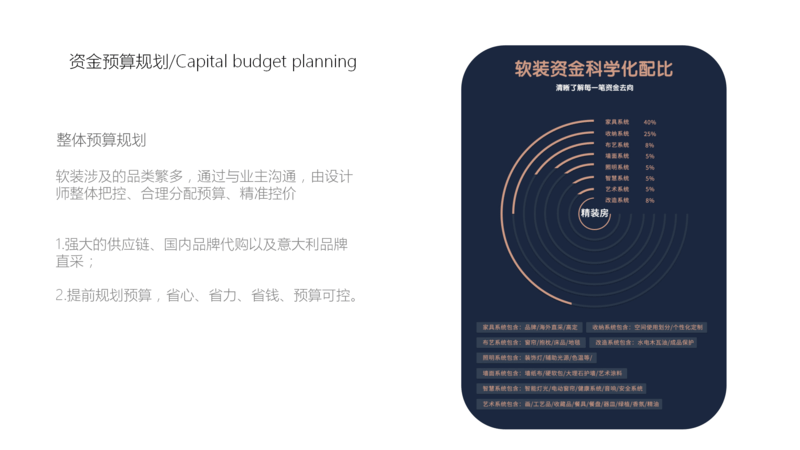 上圖是大概軟裝設(shè)計(jì)所包括的類(lèi)目和價(jià)值占比,現(xiàn)在精裝房越來(lái)越多,而軟裝設(shè)計(jì)師就是是從整體上綜合策劃裝飾裝修設(shè)計(jì)方案,體現(xiàn)出居住者的個(gè)性品位。