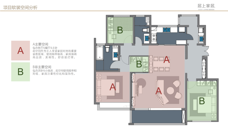 對(duì)于整體空間,一定要有主次之分(如上圖),整個(gè)空間一定以客廳、門(mén)廳、餐廳,同時(shí)包括主臥作為整體空間的 主要空間,當(dāng)然使用頻率相對(duì)更高,家具更強(qiáng)調(diào)品質(zhì)和美觀,同時(shí)具備舒適性,便于打理。